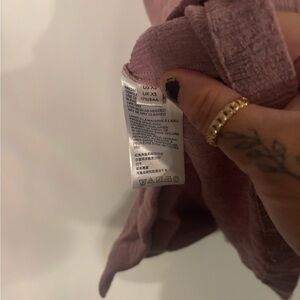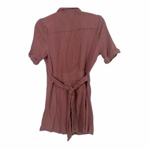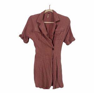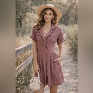 Stylish pink button-up shirt dress with short sleeves. Features a single button closure and two chest pockets.