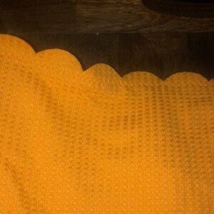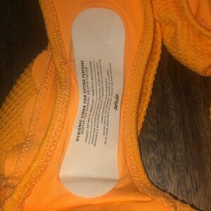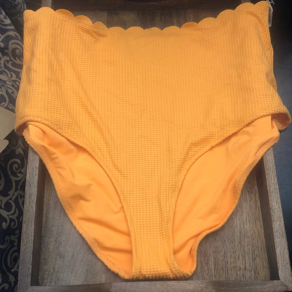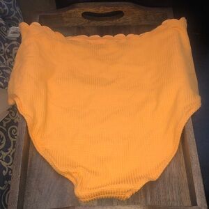 Bright orange swim bottom. High-waisted design. Scalloped edge detail.