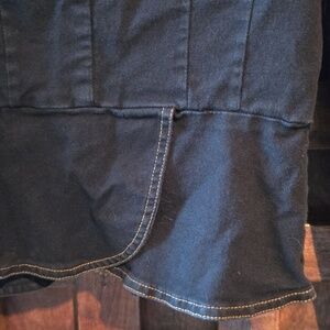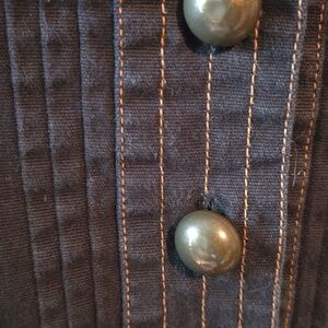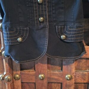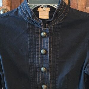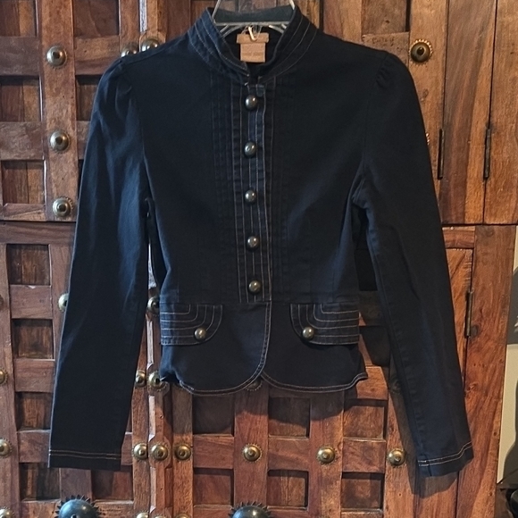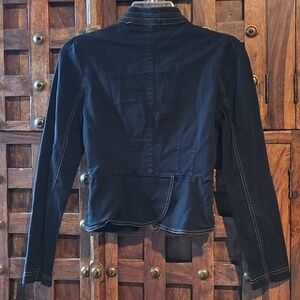 Vintage Victorian style cotton jacket. Made in late 90's. Stylish black women’s jacket with a structured, military-inspired silhouette. Features decorative front buttons and stitched pocket detailing. Lightweight and versatile for layering. Classic black color adds polish to any outfit. Pre-owned good condition. Almost perfect condition except the stitching on the back collar. Measurements pit to pit 16" length shoulder down 17.5". 97% cotton 3% spandex (19)
