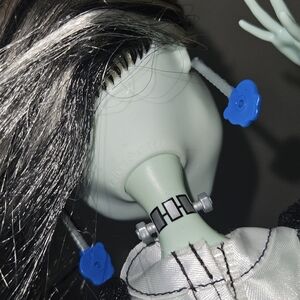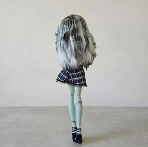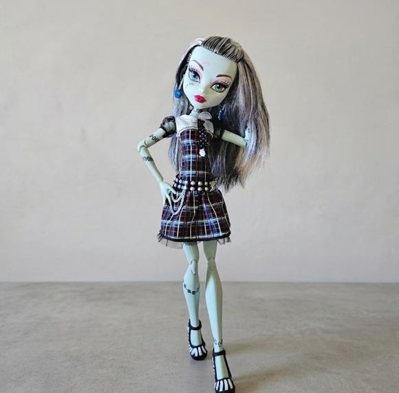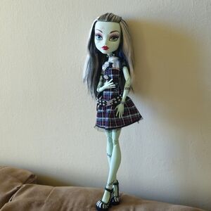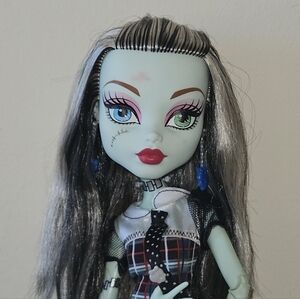 Authentic Monster High Frightfully Tall Ghouls Frankie Stein 17-inch tall doll - Features her iconic plaid dress, volt-inspired accessories, and signature stitches, designed with highly poseable with joints at the elbows, wrists, and knees, allowing her to touch her face or sit. Frankie has long black and white straight hair, a mint green complexion, and her signature mismatched blue/green eyes. Stitches are visible on her face and body. She comes with signature accessories, including blue lightning bolt-shaped shoes, a tie with a Skullette pin, earrings, and a bracelet. She has a couple of markings on her face that honestly look like they belong there like birthmarks; she's in otherwise excellent condition.