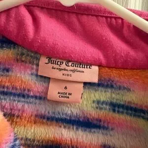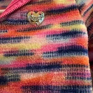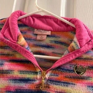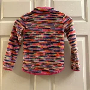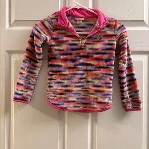 Soft pullover sweater with vibrant multicolor stripe pattern. Half-zip front with heart charm zipper pull. Pink stand collar and trim. Cozy fleece texture for everyday wear. In excellent condition. Only flaw is some piling on the collar. Size 6!