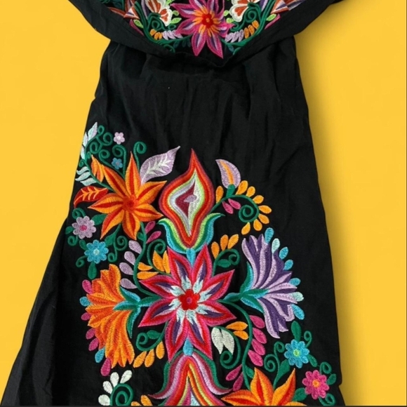 Black embroidered dress with colorful floral details. Off shoulder, midi length. Crisp fabric perfect for spring. Size L but fits more like a M. Does have some stretch.