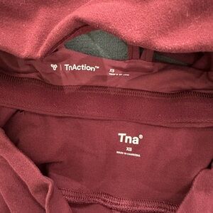 Two-piece active set from TNA. Stretchy sports bra with thin straps. High-waist leggings with a wide waistband. Soft, breathable fabric. Great for workouts or everyday wear.