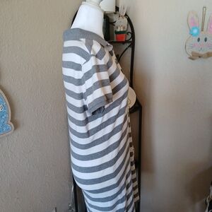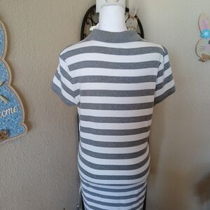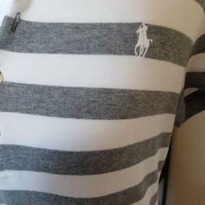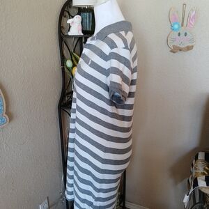 Classic polo-style midi dress by Polo Ralph Lauren. Horizontal gray and white stripes. Short sleeves with buttoned henley neckline. Casual, comfortable knit fabric. Easy to wear for everyday outings.