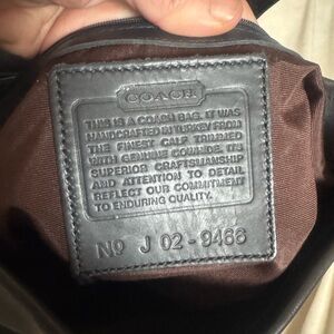 The Rare Black Vintage Coach West End Large Hobo 9466 is a stylish and high-quality shoulder bag made in Turkey in 2002. Made from calf skin leather with black stitching accents, this large rectangular bag features a snap closure and a shoulder strap handle style. The exterior and interior are both lined with black fabric, making it a sleek and timeless accessory for any woman's wardrobe. With its vintage charm and plentiful features like inner pockets and a lightweight design, this Coach bag is sure to make a statement.