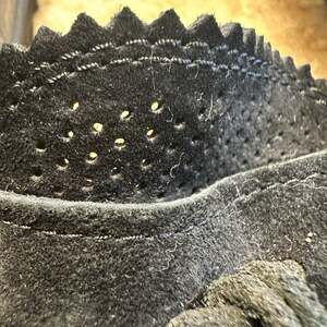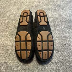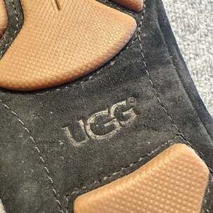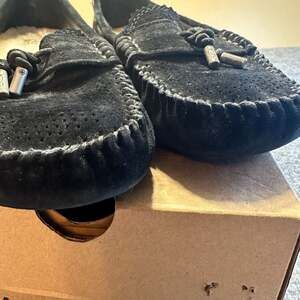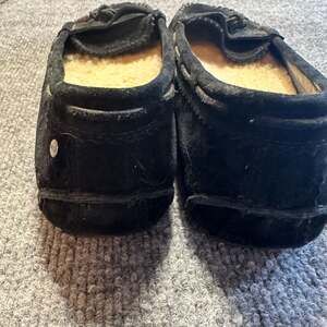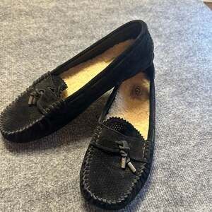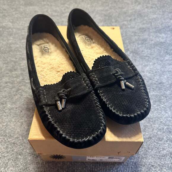 UGG Roni Black Suede Perforated Moccasin Slippers Sherpa Casual Cozy Preppy Women's size 8.5 — Classic comfort meets breathable style. Crafted from soft black suede, these slippers feature unique perforated detailing on the vamp and a scalloped tongue edge.