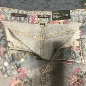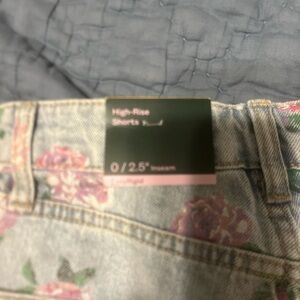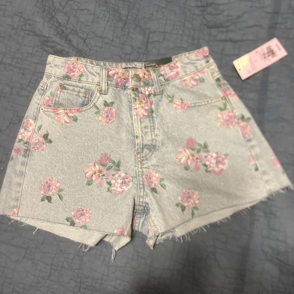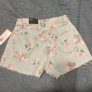 Light wash denim shorts with pink floral print. Comfortable high-rise fit with raw hem for a casual look. Soft, feminine pink flowers add a playful touch. Versatile summer staple that pairs easily with tees and blouses.