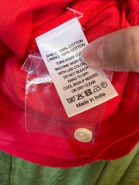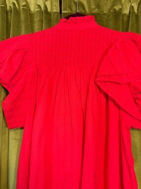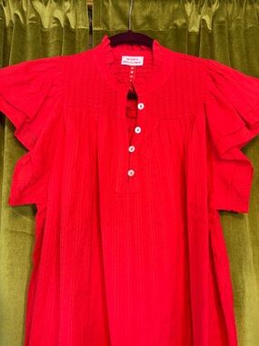 Red smock dress with buttoned henley neckline. Short flutter sleeves and relaxed silhouette. Lightweight daytime style. Easy to wear and versatile.