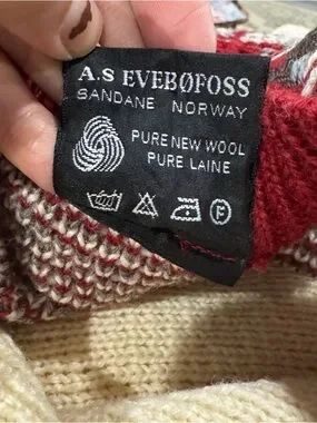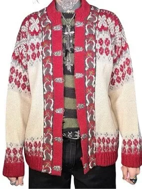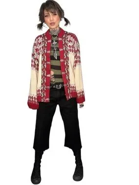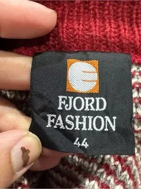 This gorgeous vintage grannycore sweater from Fjord Fashion Norway is in excellent condition. It’s got a floralish design w/metal hook buttons. It’s made of thick wool. So it’s cozy. But IMO also itchy.