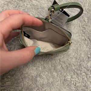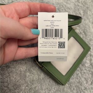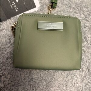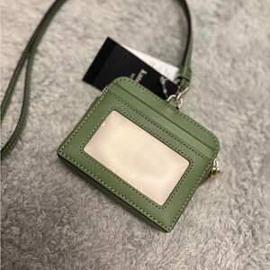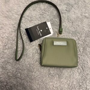 Small Kate Spade ID card lanyard in olive green. Zip closure with polished logo plate. Removable wrist/crossbody strap. Smooth, structured exterior. Brand new with tags and in perfect condition.