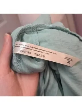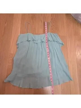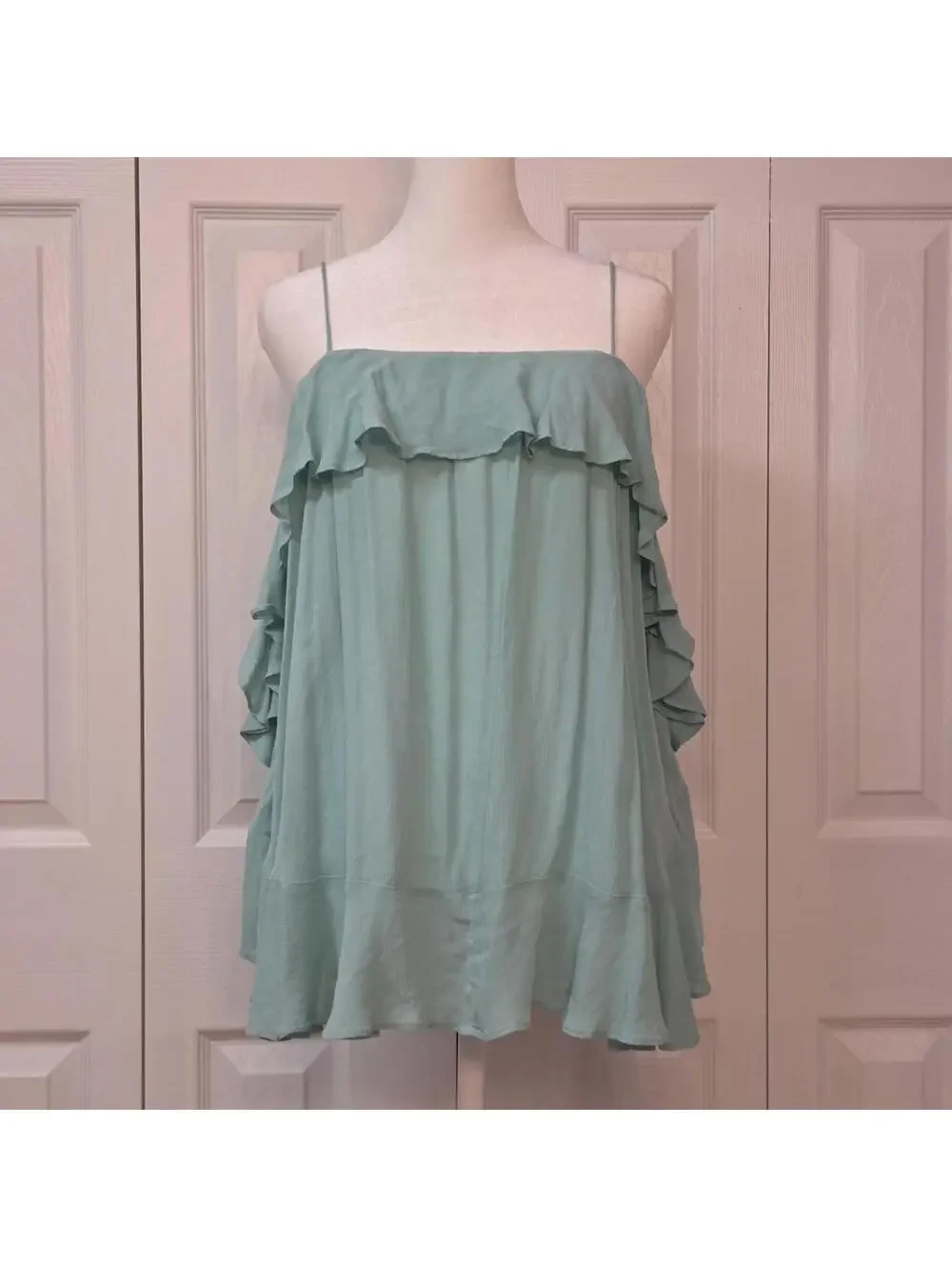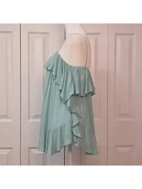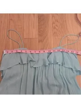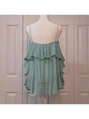 Features: seafoam green / aqua blue rayon fabric, fixed length spaghetti straps, tunic length, oversized silhouette, tiered ruffle detailing, square / straight neckline, pull over style