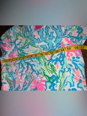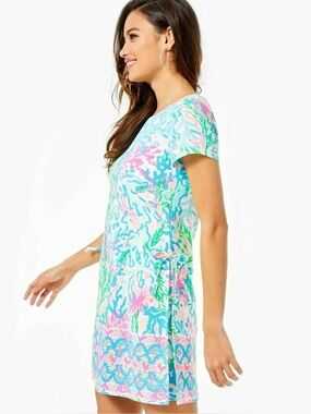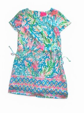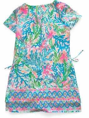 Lilly Pulitzer Blanca romper in a coral reef print with blue, pink, and green tones. Short sleeves with a round neckline and decorative side buttons. Romper design with hidden shorts.