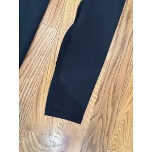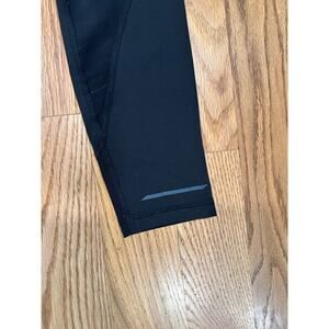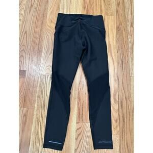 Black. Mesh detail. Reflective strips. Back waistband pocket. Inseam is 25 inches.