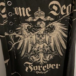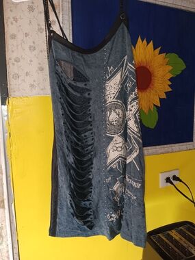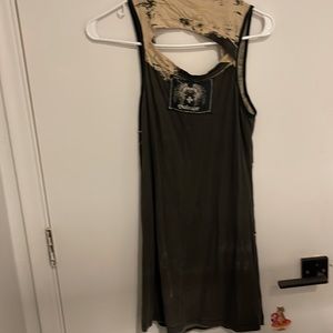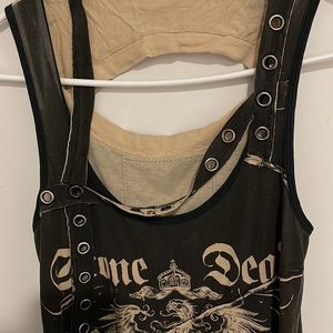 Edgy black tank dress with cream graphic eagle print. Features grommet detailing and racerback cut for a bold, modern look. Lightweight and versatile for layered styling. Includes cream accents that enhance the graphic design.