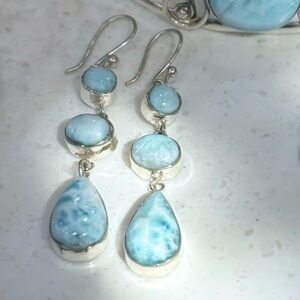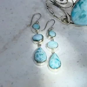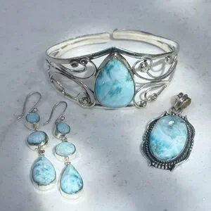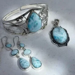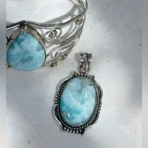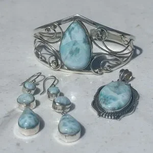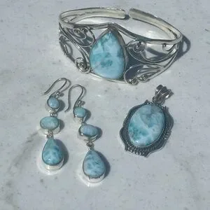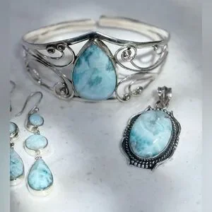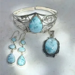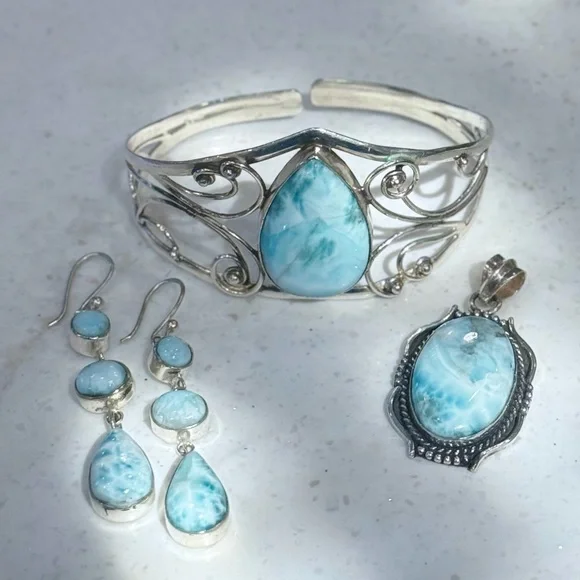 Elegant blue larimar set featuring a teardrop center stone bracelet, matching pendant, and dangle earrings. Crafted in 925 sterling silver with calming Caribbean-blue larimar. Perfect for everyday wear or special occasions. Includes blue larimar pieces for coordinated styling.