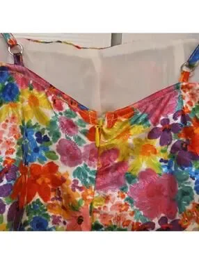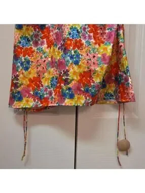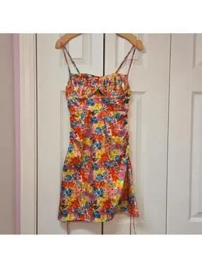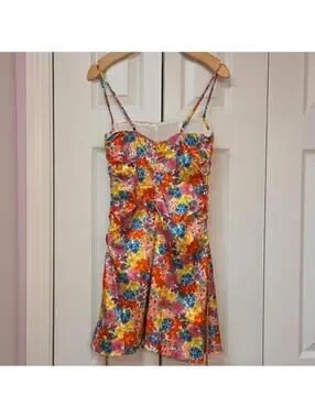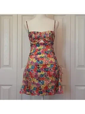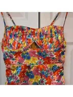 Features: bright multicolor floral dopamine dressing print, pleated bustier-style top, underwire cups, keyhole detail, adjustable ruched body, spaghetti straps, mini length.