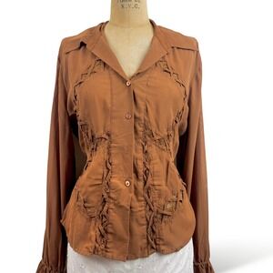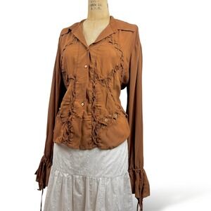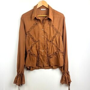 Western earthy brown lace-up blouse features a distinct y2k aesthetic with intricate lattice detailing and sheer bell sleeves. The lightweight fabric offers a soft, airy feel, making it a perfect statement piece for layering or a boho-inspired night out.