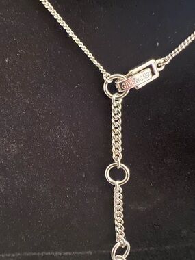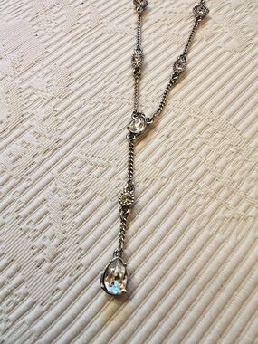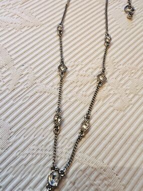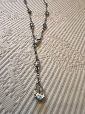 Delicate silver-tone lariat designer fashion necklace featuring decorative linked stations and a drop pendant. Lightweight and elegant, the silver color adds warm shine to any outfit. Adjustable lengths. Subtle, feminine design that layers well and elevates both casual and dress looks. Comes with its own gift box