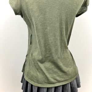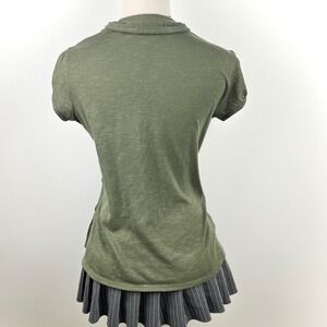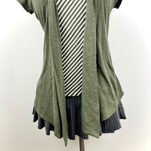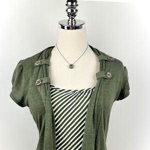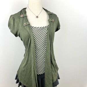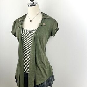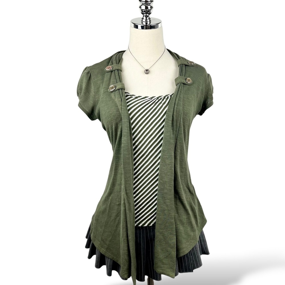 This Y2K layered top features an olive open-front cardigan with button shoulder details over a striped tank. Soft stretch fabric with a flattering draped fit—perfect for indie sleaze, casual layering, or everyday styling.