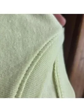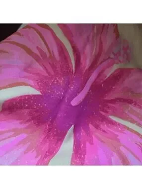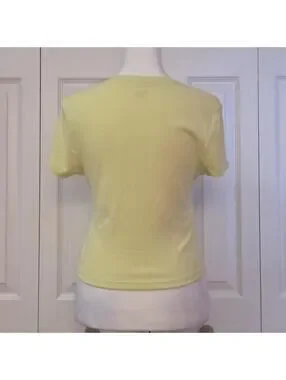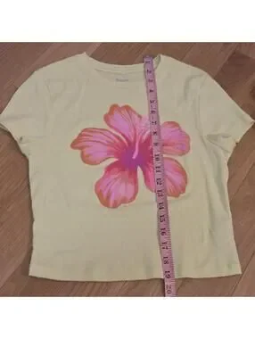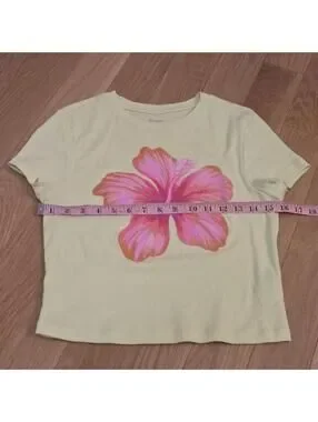 Features: Light yellow cotton fabric, Hawaiian hibiscus flower print in tropical tones (soft pink, coral / peach, magenta), slim fit, short sleeve, crew neckline, slightly cropped length.