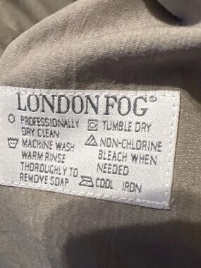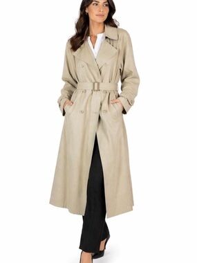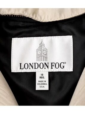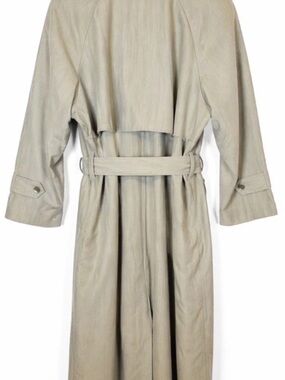 Long double-breasted trench coat by London Fog. Features a notched collar and belted waist. Button-tab cuffs and front pockets. Neutral beige tone for versatile styling.