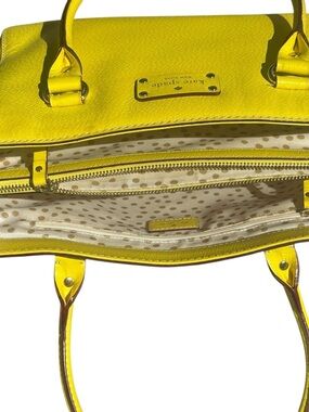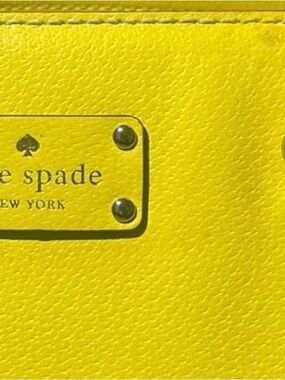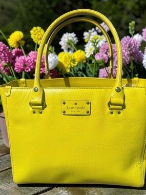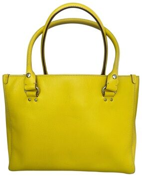 Kate spade tote! Structured leather tote with dual top handles. Gold-tone logo plaque on front. Bright yellow color makes a bold statement.