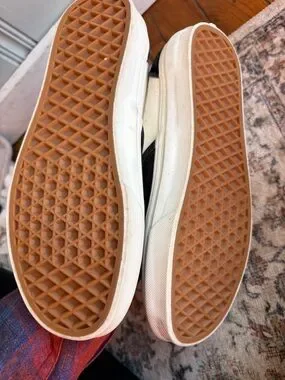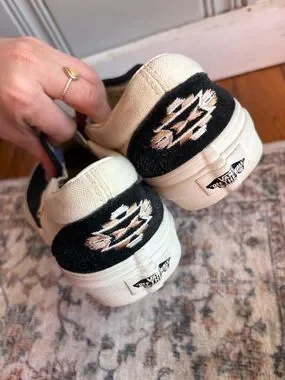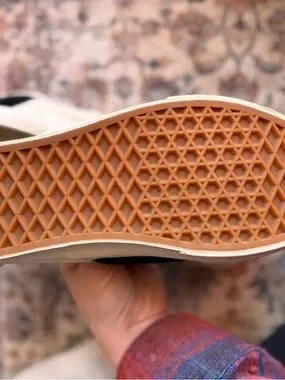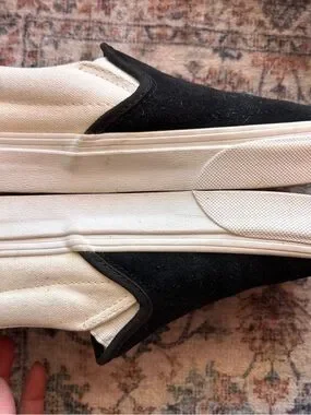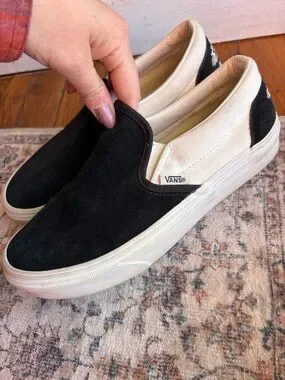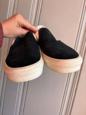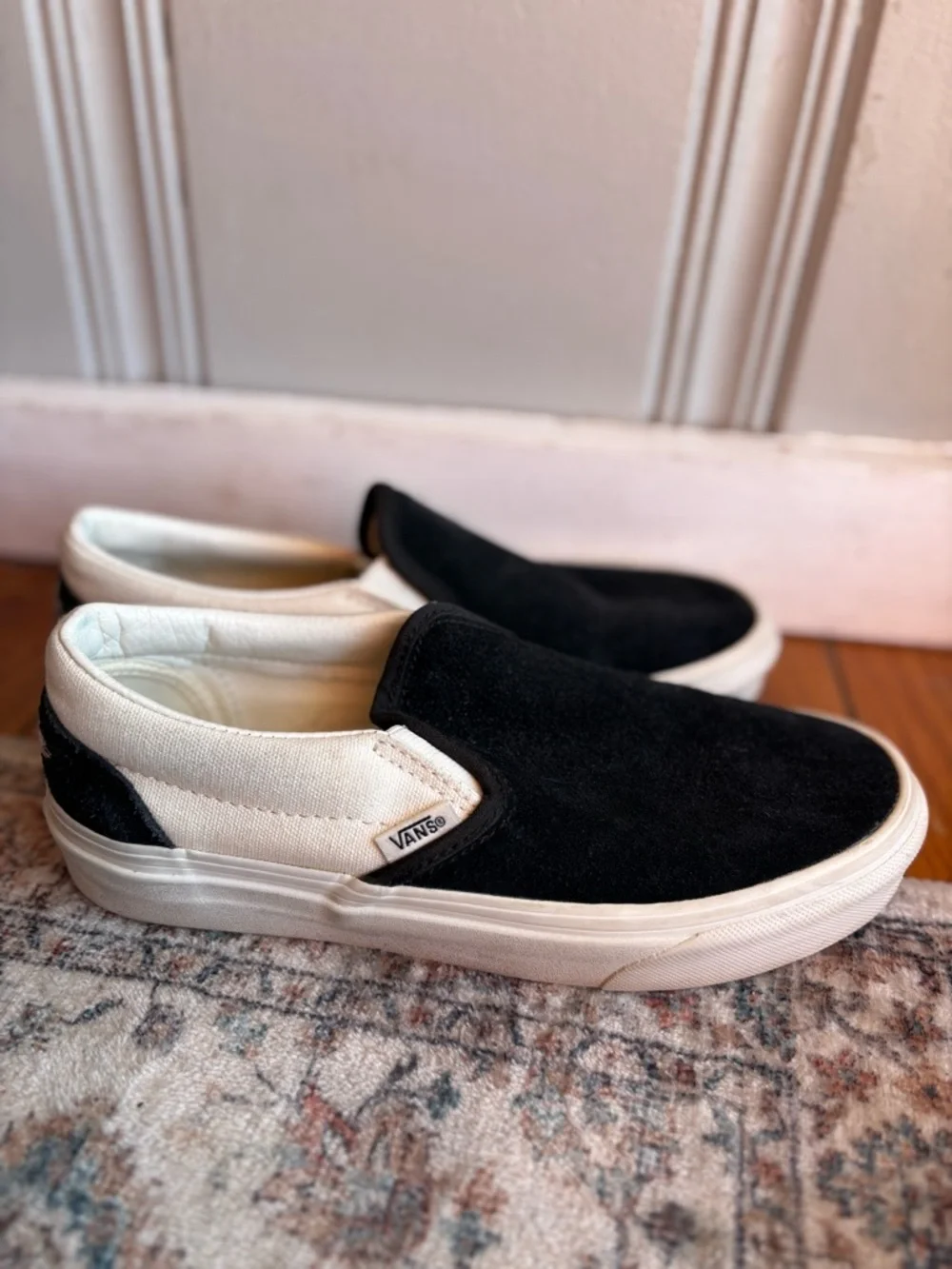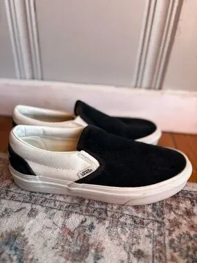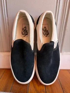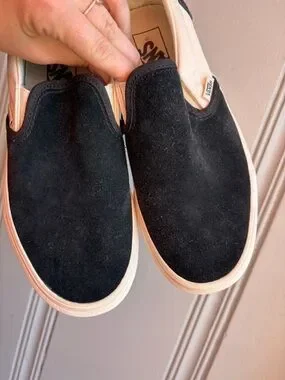 Classic slip-on silhouette from Vans. Black suede-like upper with white canvas collar and midsole. Low-profile skate styling and elastic side accents. Simple, versatile everyday shoe.