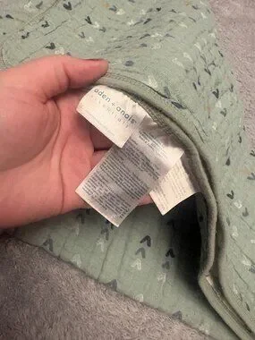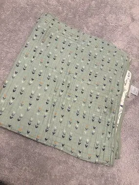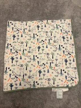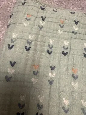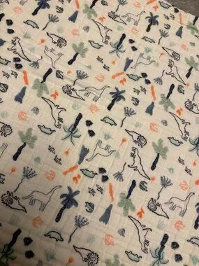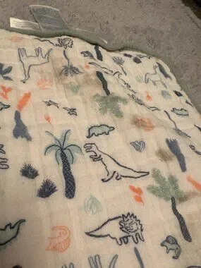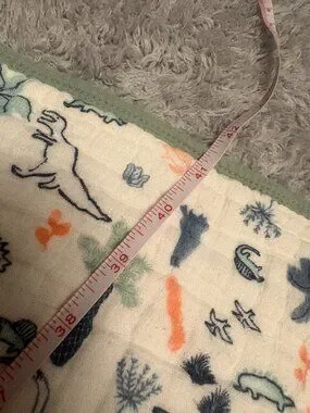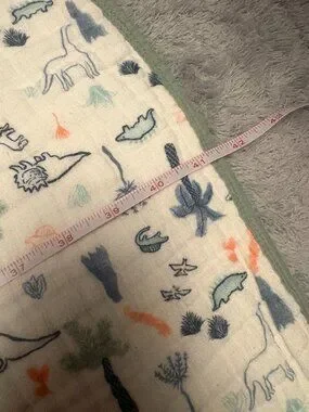 Aden & Anais 100% cotton blanket. Is reversible. One side features a dinosaur print, and the other side has hearts. There is a small dark spot on each side. No holes or other flaws though. The blanket measures approximately 41.5 by 41.5