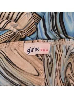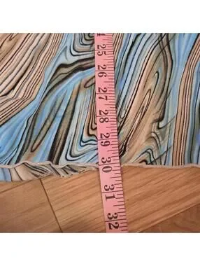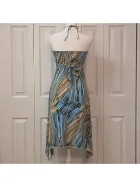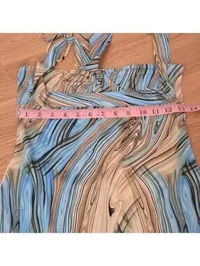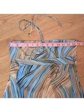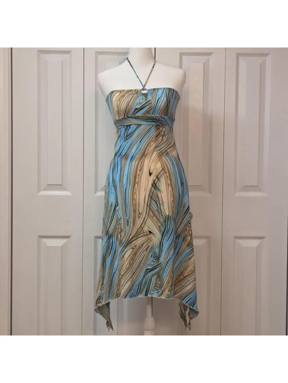Features: aqua turquoise blue and beige khaki brown abstract marble swirl print, empire / babydoll waist, tie-back sash, strapless / bandeau-style neckline, halter neck tie, asymmetric a-line fairy hem, knee to midi length. Perfect for the beach and summer vacations.