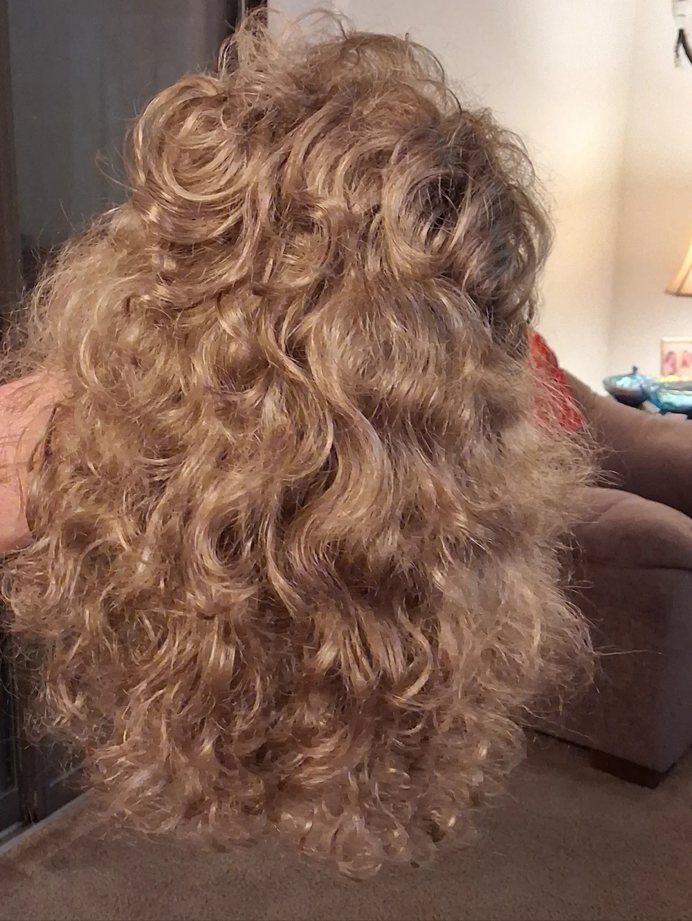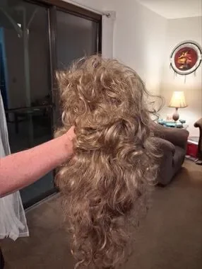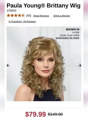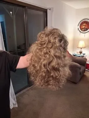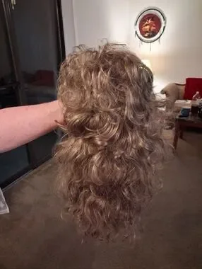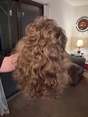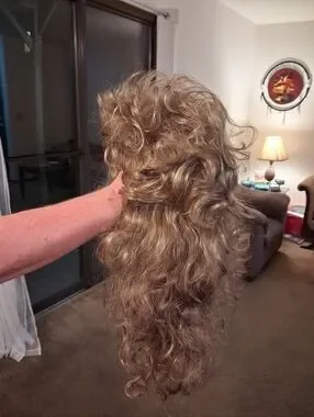 Paula Young long wig with beautiful, relaxed curls. The multiple layers of the long, relaxed spiraled curls give you plenty of styling options. All-over stunning spirals drape down with bounce for unforgettable style. It's the long, lush hair you've always wanted. Volume-rich curls complement every woman. Easy-care synthetic fiber holds the style with little to no upkeep. Open ear tabs are ideal for individuals who wear eye glasses. Permatease and Permalift provide volume and fullness without adding weight. Been in storage, boxed. Fluff and comb after receiving.