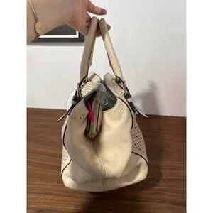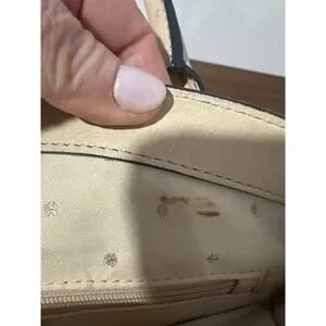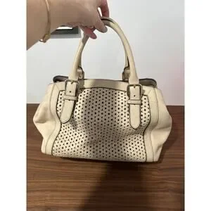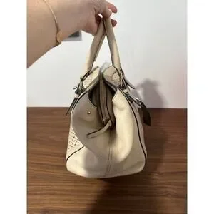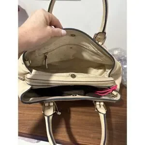 Leather. Dark cream color. Magnetic closure. Three separate compartments. Cream lining with gold metallic dots. Removable shoulder strap.