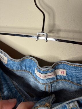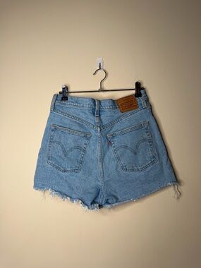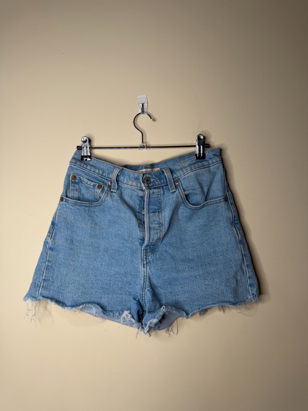 Light blue denim shorts with a high-rise waist and relaxed fit. Raw hem detail adds a casual, worn-in look. Functional front pockets and belt loops for everyday wear. Versatile summer staple that pairs easily with tees or blouses.