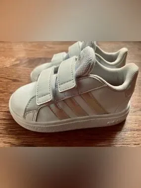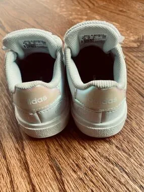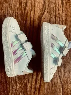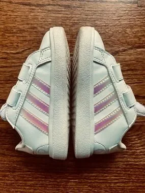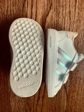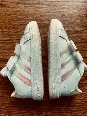 Clean white design with super cute iridescent 3-stripes that reflect light—perfect for everyday wear or dressing up casual outfits.