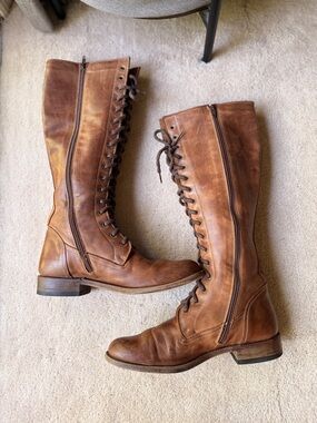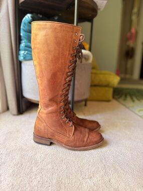 Tall knee-high lace-up boots by Frye. Smooth tan leather upper with full lacing. Sturdy low heel and durable sole. Versatile classic styling for everyday wear.