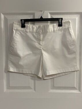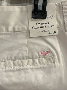 Clean white chino bermuda shorts by Vineyard Vines. Features belt loops and slanted front pockets. Structured yet comfortable cotton fabric. Simple, versatile style for warm-weather wear.