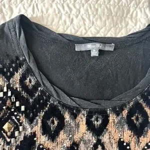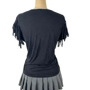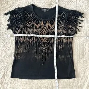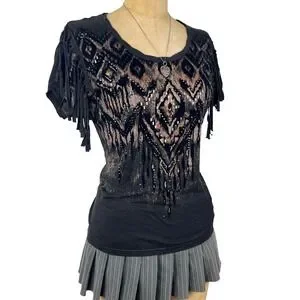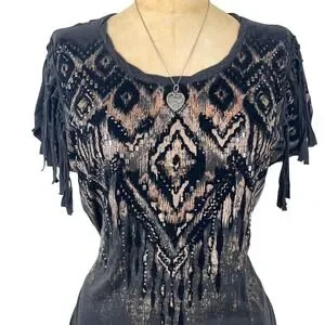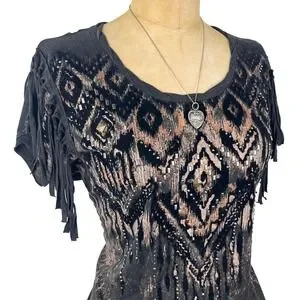 Western boho miss me top with fringe sleeves and an intricate embellished graphic. Has features metallic studs, velvet-textured accents, and a distressed print.