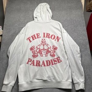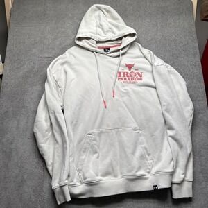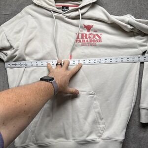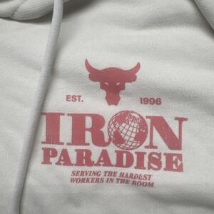 Train like The Rock in this Under Armour Project Rock hoodie featuring the bold Iron Paradise graphic. With ultra-soft fleece and a classic fit, this beige pullover is perfect for workouts, warmups, or laid-back athletic style.