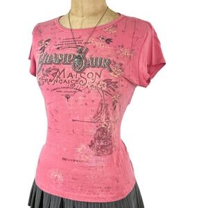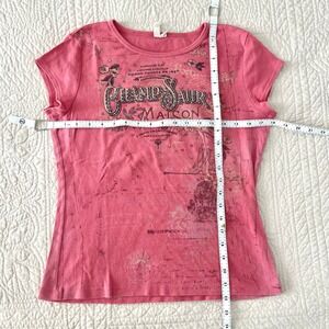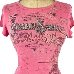 French aesthetic Y2K short sleeve graphic tee with floral accents and "Champsaur Maison Française" script, embellished with subtle rhinestones.