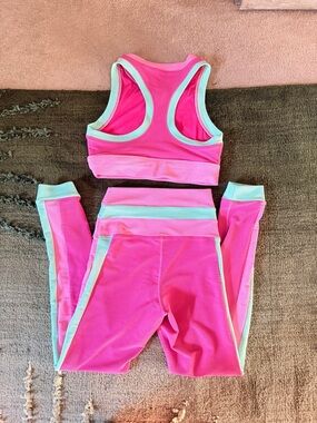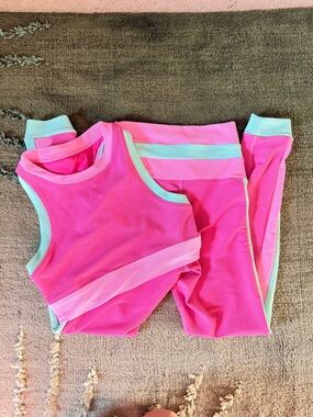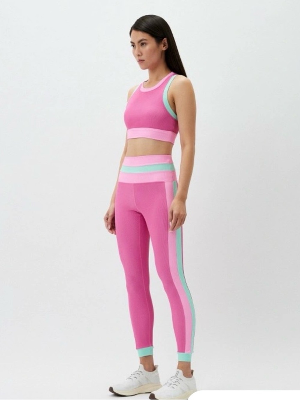 Vibrant pink crop tank with mint and light pink trim. Matching high-waist leggings with mint side stripes and cuff accents. Sleek, sporty two-piece. Bold colorblock look for workouts or athleisure.
