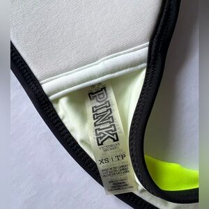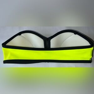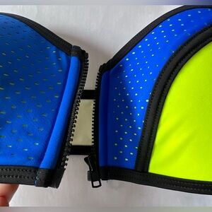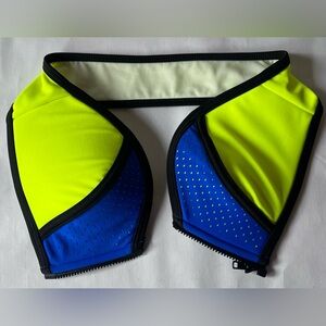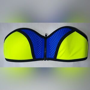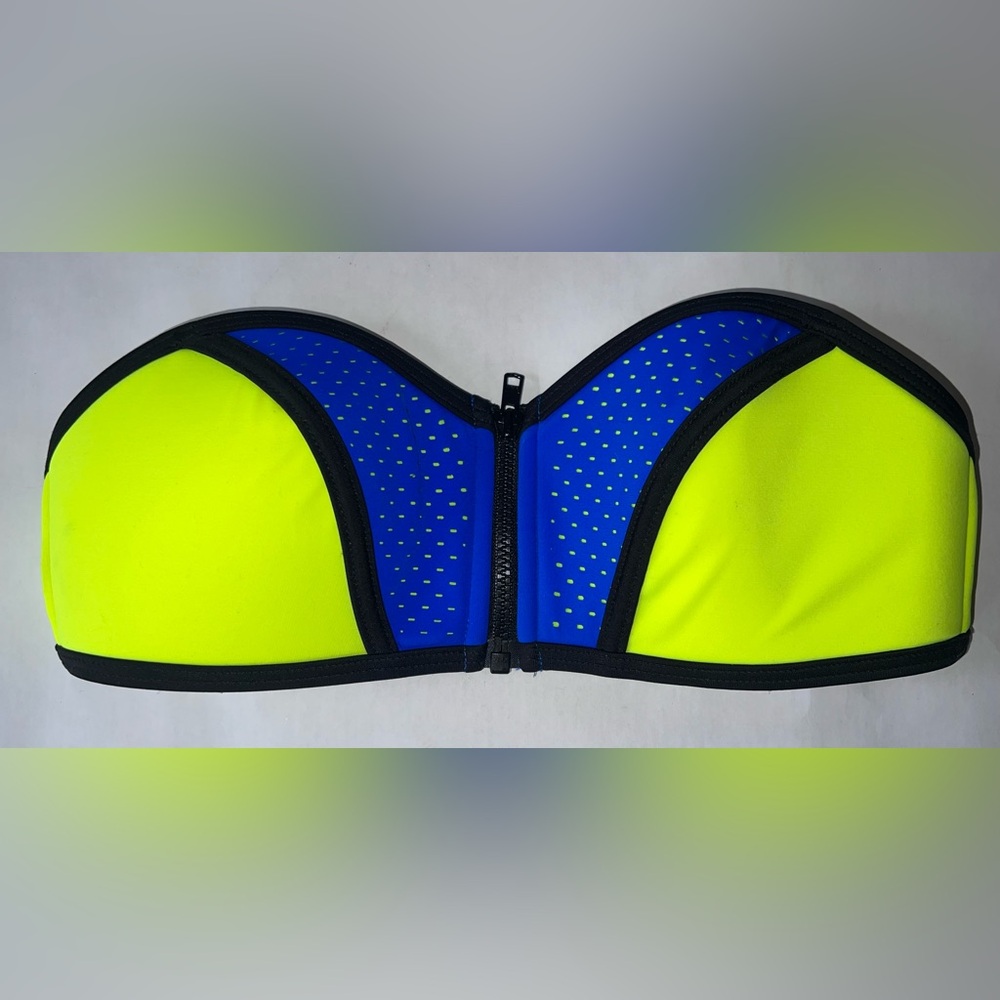 Stylish strapless bikini top in vibrant blue and yellow. Perfect for a bold beach look.