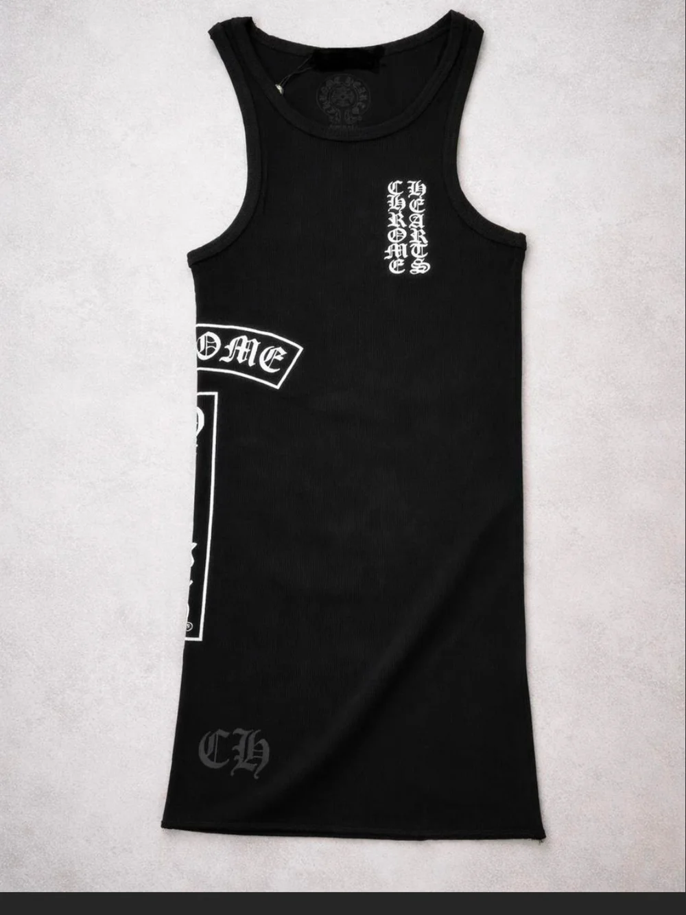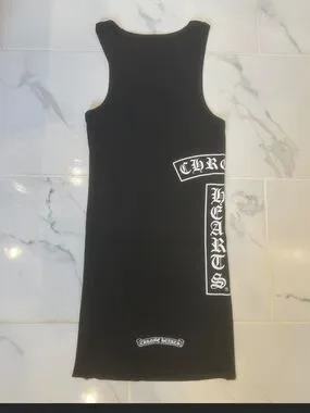 Chrome Hearts Sleeveless black tank dress with white gothic graphic lettering. Straight silhouette. Bold chest and side print details. Easy edgy style for layering or solo wear.