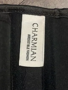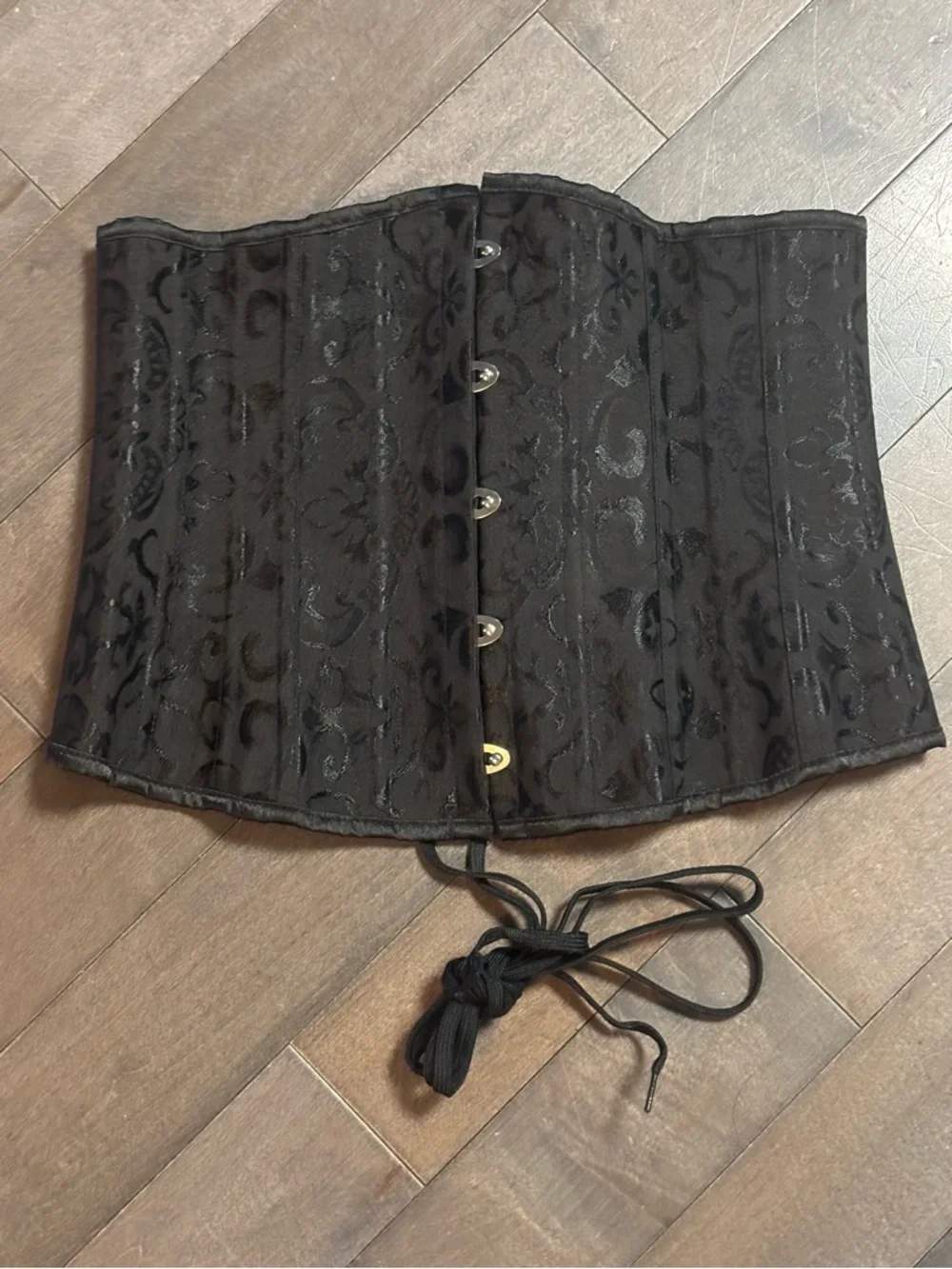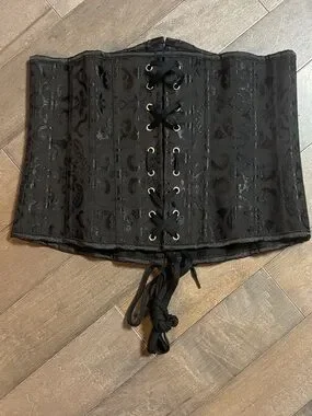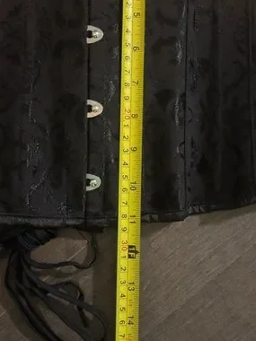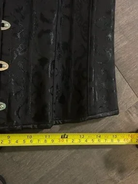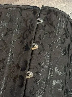 Black brocade corset-style waist cincher. Front steel busk closures and back lace-up ties. Subtle floral jacquard pattern. Structured boning for shaping.