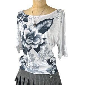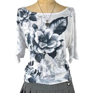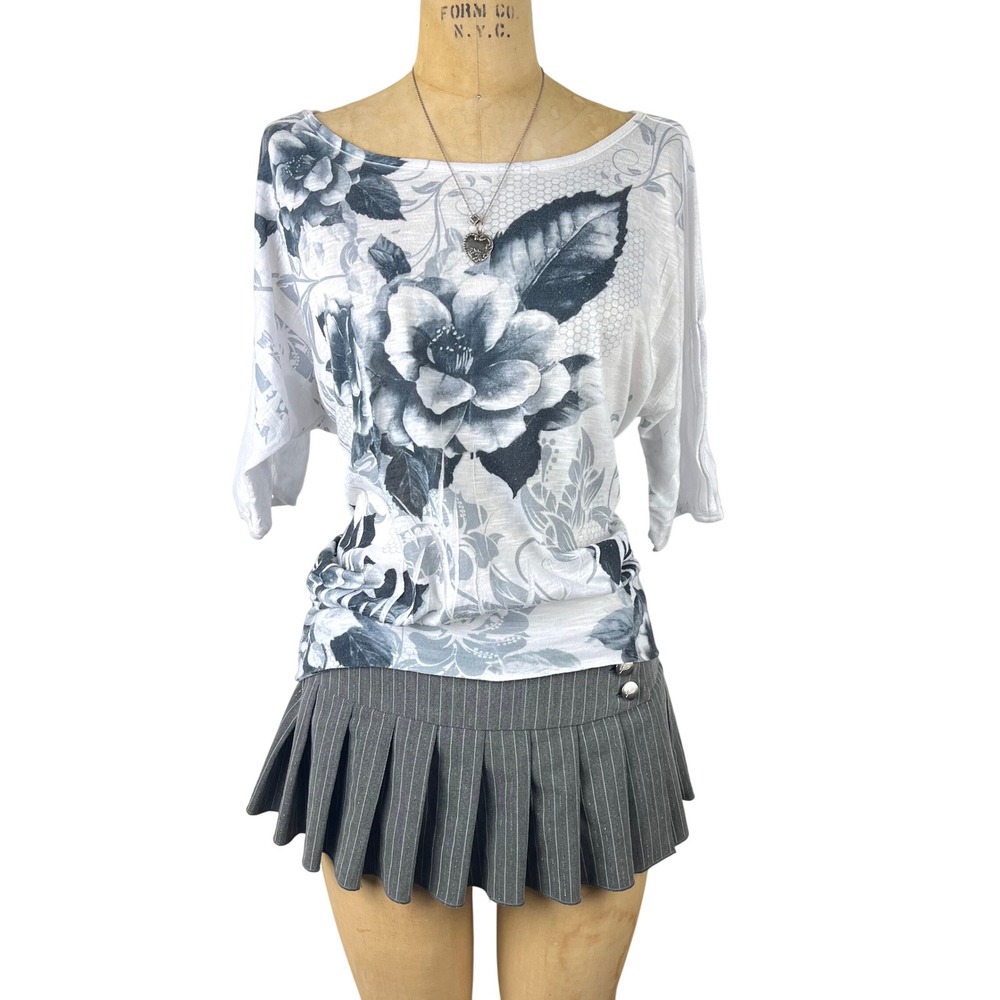 Y2K grunde floral graphic top with boat neck and cold shoulder batwing sleeves.