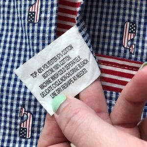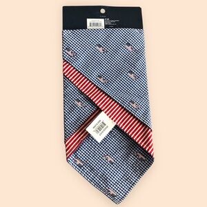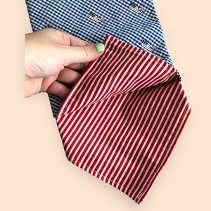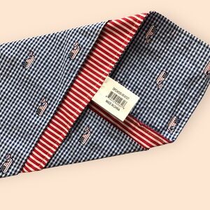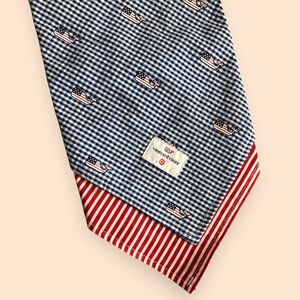 One side has blue and white checkered pattern with Vineyard Vines whale logo with the American Flag