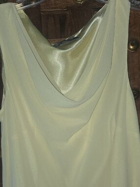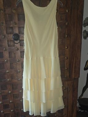 Vintage 90's yellow sleeveless dress with cascading ruffle tiers. Soft draped neckline for a flattering silhouette. Lightweight fabric that moves beautifully. Perfect for daytime events or special occasions. There is a hidden small weight in the front to keep the shape off the neckline. Pre-owned almost perfect condition except the tiny stain, barely visible in the front (pictured). Measurements length shoulder down 43", pit to pit up to 21", lenght pit down 34" (20)