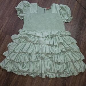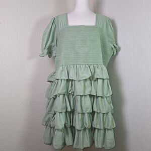 Romantic and feminine, this JessaKae Collection smocked ruffle dress features a soft sage green hue with a flattering smocked bodice, square neckline, and puff sleeves. The tiered ruffle skirt adds beautiful volume and movement, creating a whimsical, cottagecore-inspired look.