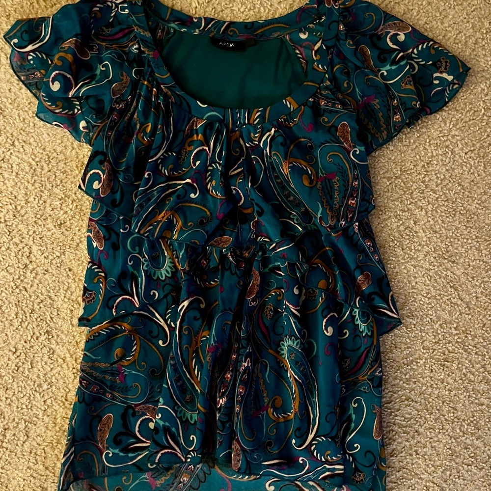 Deep teal sheer layered Apt. 9 blouse. Lined, so fits closer underneath, outer layer flows, and has forgiving sheer layers in front. Size M