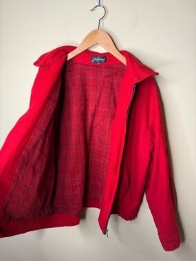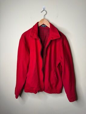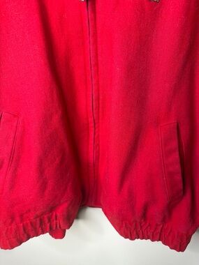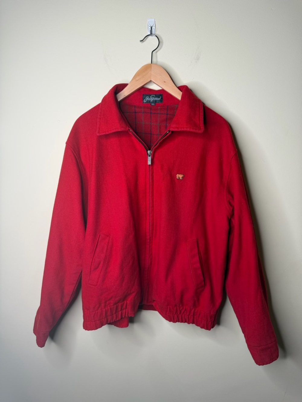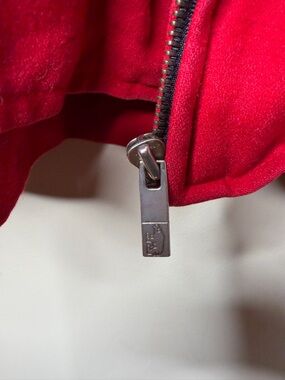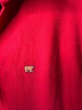 Classic red zip-up fleece jacket. Features an embroidered bear logo on the chest. Zip front and hand pockets. Soft, warm fleece fabric.