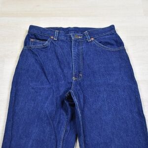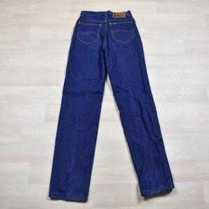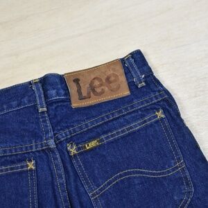 Vintage 70s Lee Riders jeans.  Dark wash.  Stamped rivets.  Fairly nice pre-owned condition.  No notable flaws.  Some uneven distressing on one leg (pic #4).  Light, usual fabric wear for a pre-owned item.  Please see and zoom all photos and treat them as part of the description.  Size is marked 5; runs much smaller.  See actual measurements below to ensure a proper fit. Consulting measurements is the ONLY way to get a proper fit when buying online.  Ask any questions prior to purchasing.