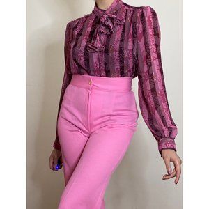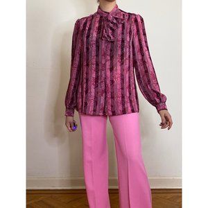 (SOLD ) 80'S Pink Floral Jabot/Ascot Bow Long Sleeve Blouse (S)